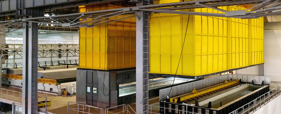 Предварительная обработка. Далее траверсы поступают в тоннель химической подготовки, где происходит автоматический процесс обезжиривания, травления и флюсования.