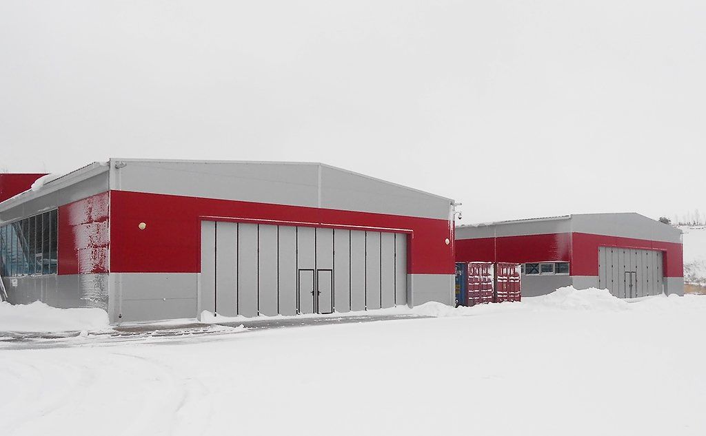 Ворота установлены в ангарах для вертолетов, они устойчивы к ветровым нагрузкам за счет нижней направляющей и отлично сохраняют температурный режим в помещении — зимой после закрытия створок в ангаре становится тепло уже через несколько минут. Встроенные калитки избавляют от необходимости открывать ворота целиком при входе и выходе из ангаров.