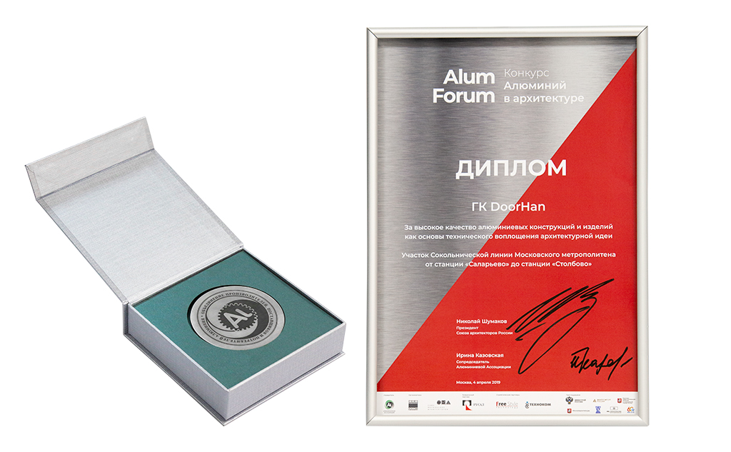 Компания DoorHan также приняла участие в конкурсе «Алюминий в архитектуре», по итогам которого была награждена дипломом и медалью за высокое качество алюминиевых конструкций и изделий как основы технического воплощения архитектурной идеи. Объект строительства, удостоенный этой почетной награды — участок Сокольнической линии Московского метрополитена от станции Саларьево до станции Столбово (проект архитектурного бюро Тимура Башкаева). На данном объекте применялась алюминиевая промышленная фальцевая кровля и алюминиевые архитектурные системы DoorHan.
