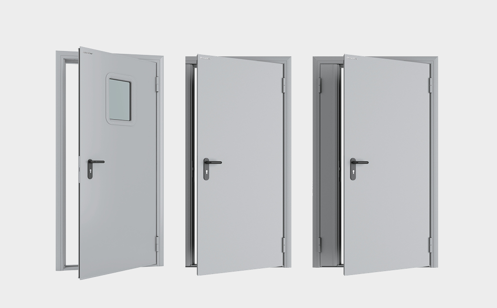 - Вариативные конструкции: выбор между правосторонним и левосторонним открытием, глухое полотно или вариант с остеклением. Дополнительные опции включают доводчики, антивандальное покрытие и другие полезные аксессуары.
