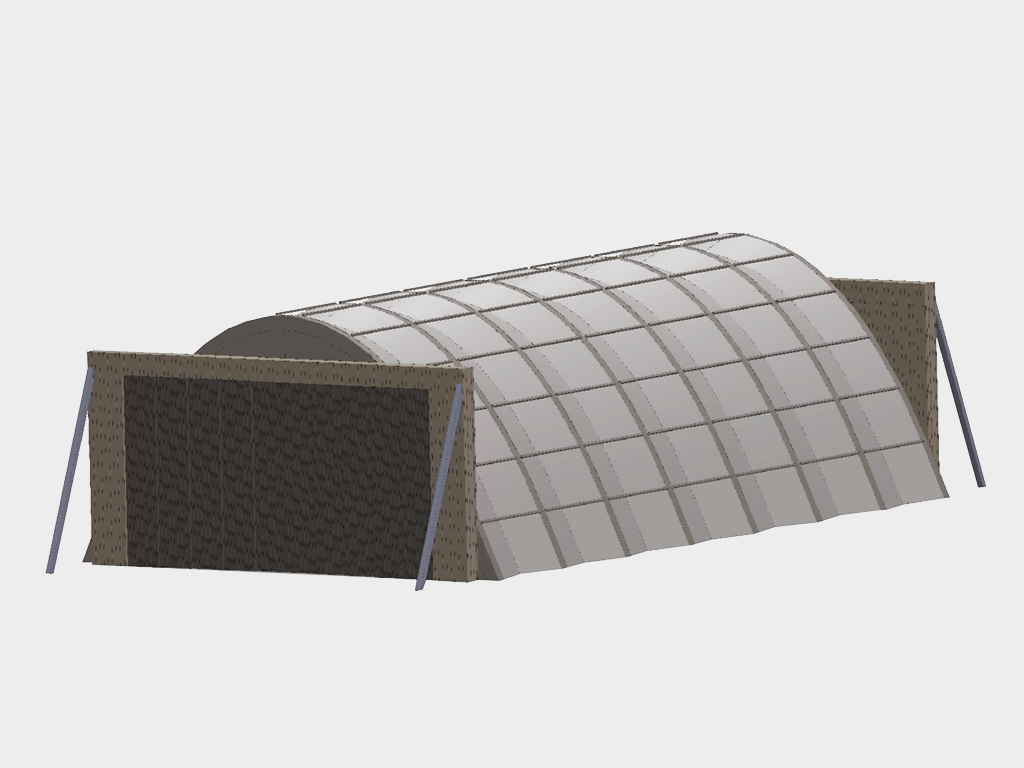 Верх полотна закреплен на металлоконструкции строительной части ангара с помощью узлов крепления, позволяющих регулировать натяжение тентов. |