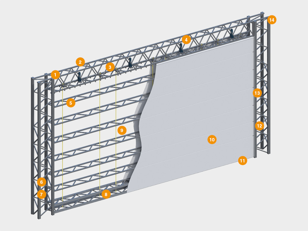 На колоннах по краям проема установлены направляющие для перемещения горизонтальных ферм и нижней балки. Боковые направляющие представляют собой алюминиевый профиль специальной конфигурации, обеспечивающий строго определенное перемещение полотна ворот. |