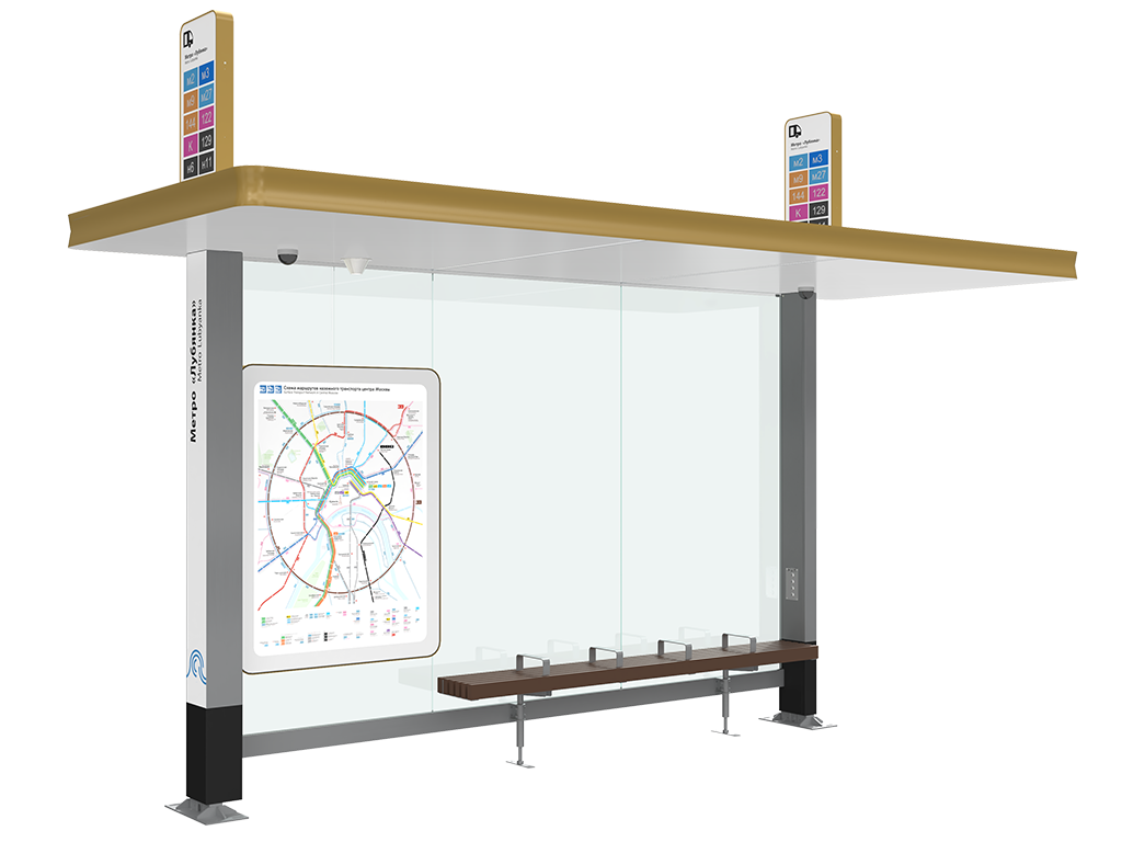 В остеклении конструкции используется закаленный триплекс, который в случае повреждения не осыпается, а покрываясь мелкими трещинами, остается в прежнем положении в раме остановочного павильона. Кроме того, павильон оборудован системой видеонаблюдения.