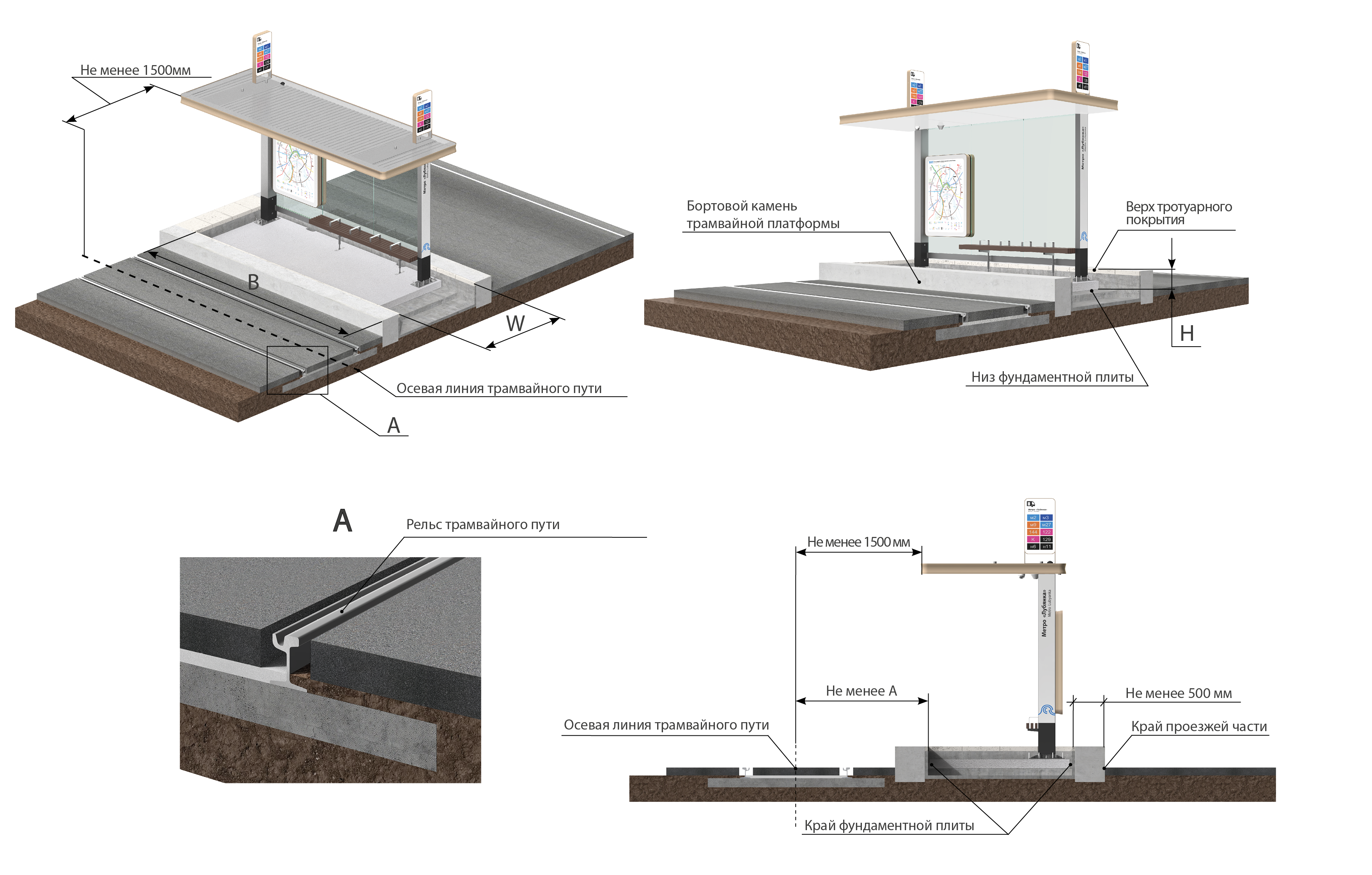 A — не менее 1300 мм при ширине крыши павильона 1800 мм.
