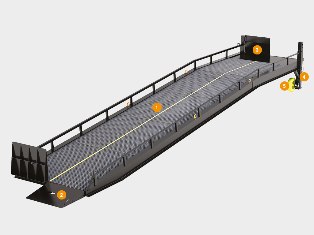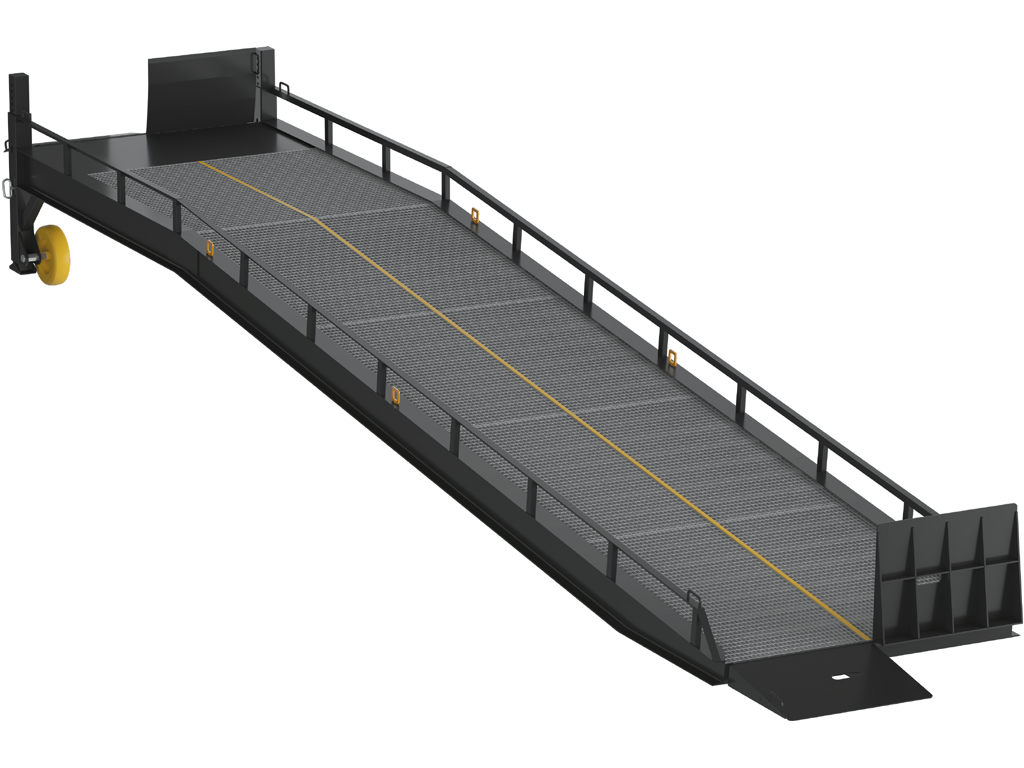 Мобильная рампа серии RMFS используется для односторонней загрузки транспортного средства без опоры на его кузов. Устойчивость рампы обеспечивается двумя опорными ногами, а для компенсации расстояния между рампой и кузовом грузового автомобиля используется поворотная двухсегментная аппарель. Гарантией безопасного движения по проезжей части рампы является материал поверхности, обеспечивающий надежное сцепление с колесами погрузчика и стальное ограждение, предотвращающее выезд погрузчика с рампы.