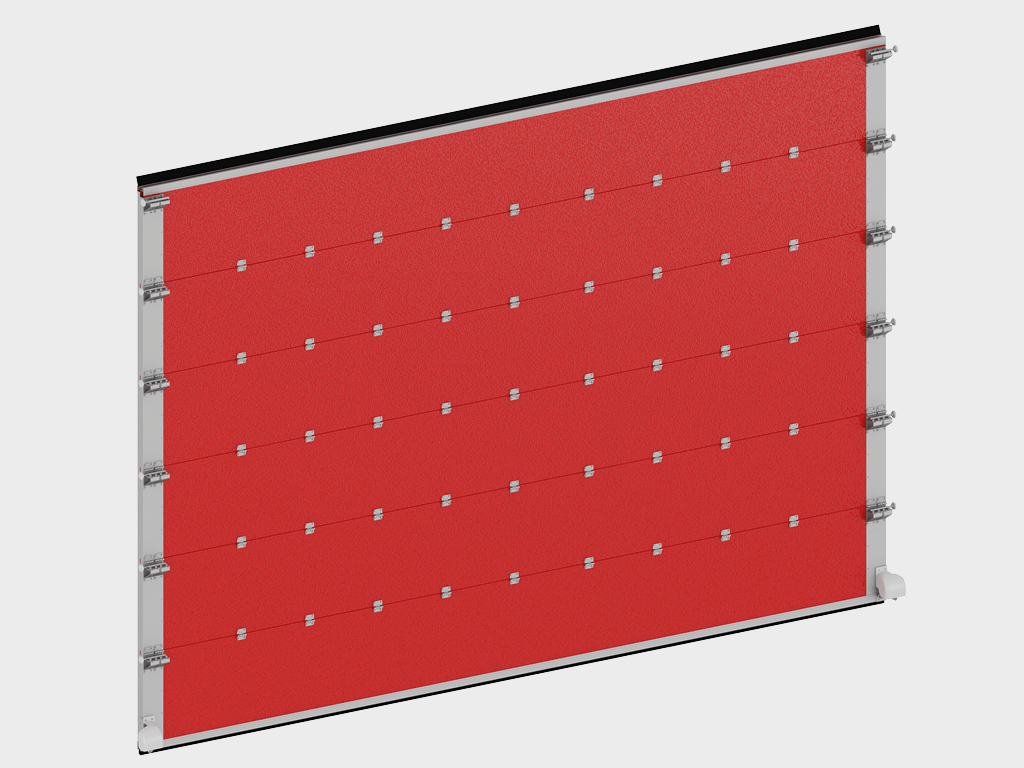 Щит ворот толщиной 60 мм из стальных сэндвич-панелей с минеральной ватой высокой плотности и усиливающими профилями. |