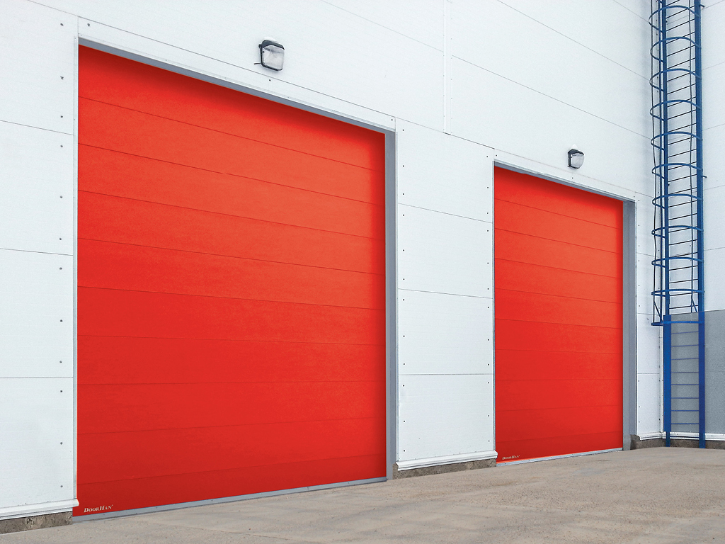 Секционные противопожарные ворота применяются в качестве защиты от огня и распространения дыма в смежные с источником возгорания помещения. Изготавливаются из специальных огнестойких панелей с минераловатной прослойкой, имеют конструкцию классических секционных ворот. По периметру ворот крепится резиновый уплотнитель и терморасширяющаяся лента, которая при нагревании увеличивается в размере и герметизирует проем. Устанавливаются в промышленных и складских помещениях, на парковках, в жилых и торговых комплексах. Для автоматизации противопожарных секционных ворот применяются электроприводы DoorHan, которые при получении сигнала с пожарной сигнализации переводят ворота из их стационарного положения «открыто», в закрытое.