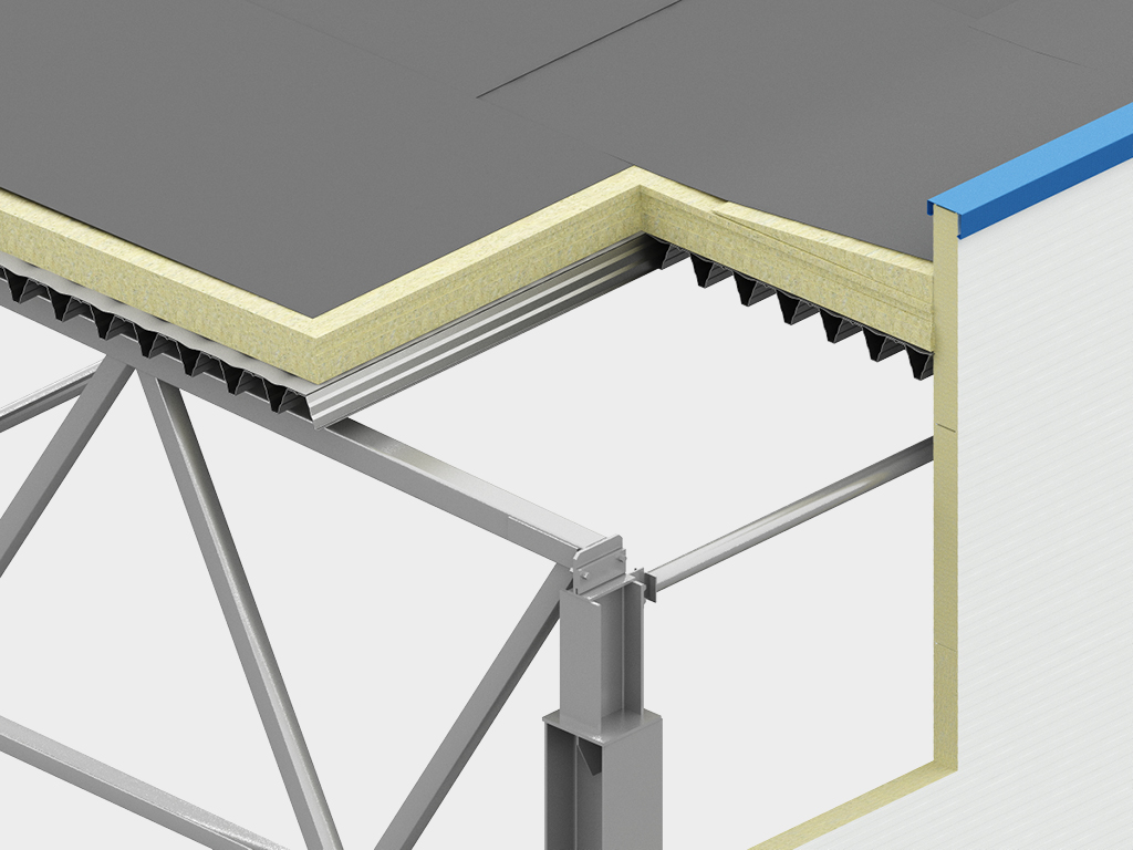2. Прогоны кровли и стен выполнены по разрезной схеме из гнутых оцинкованных С-образных профилей. Плотность цинкового покрытия — 275 г/м². Шаг кровельных прогонов определяется в процессе проектирования.