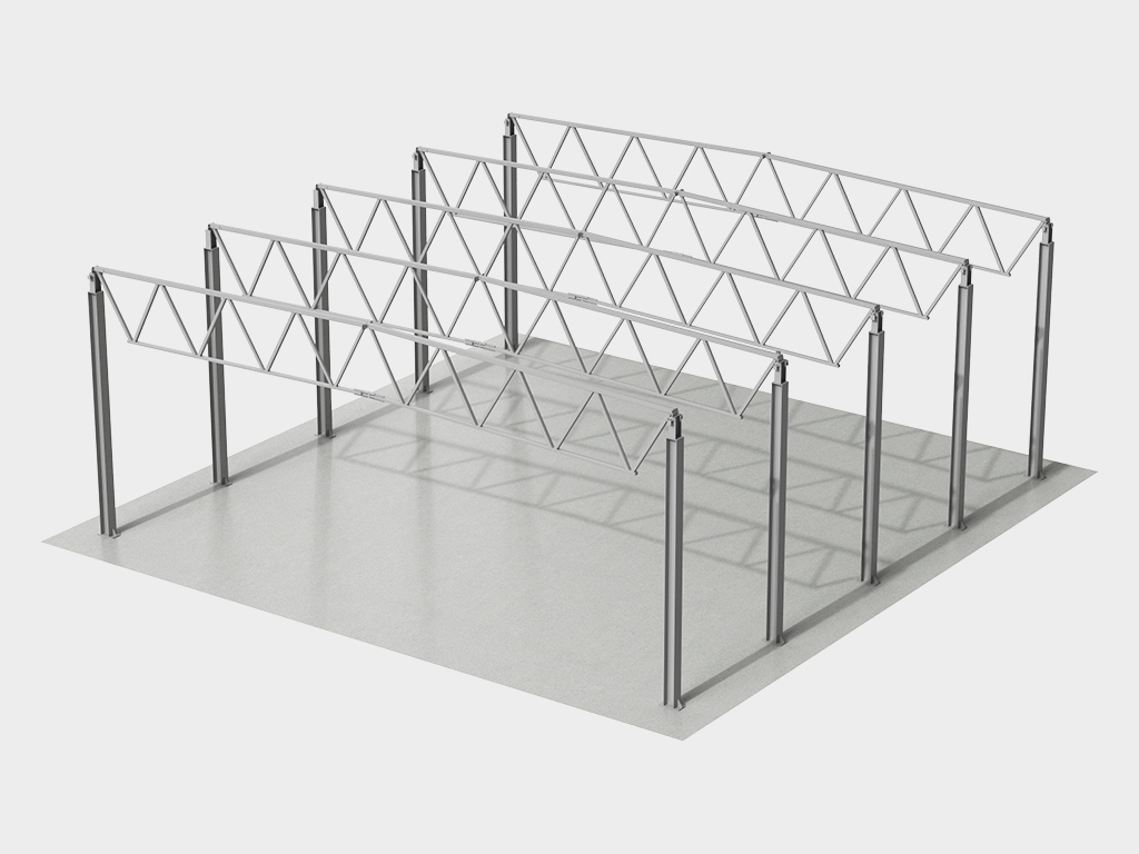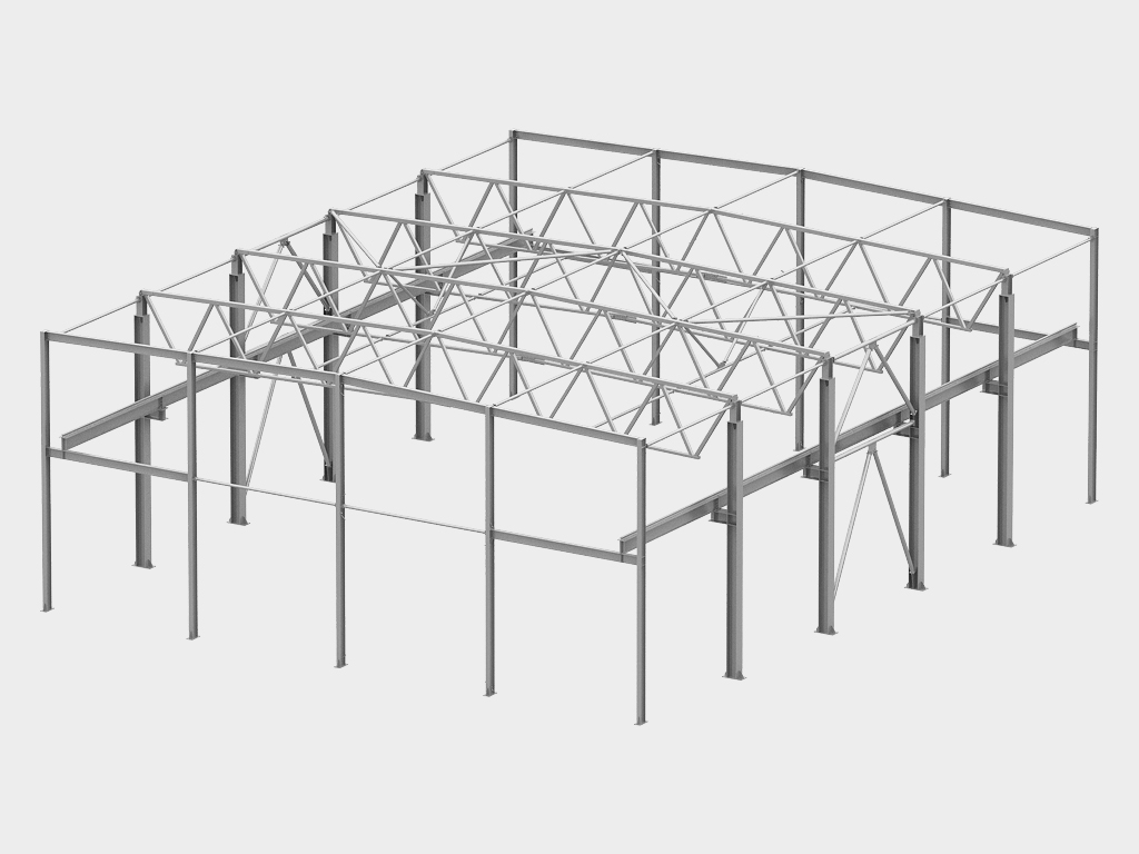 1. Каркас здания решен в виде несущей однопролетной либо многопролетной стальной рамы из стропильных/подстропильных ферм трубчатого сечения. Стропильные фермы запроектированы из труб прямоугольного и квадратного сечений с опиранием на верхний пояс. Опирание стропильных ферм на колонны — шарнирное. По торцам здания устанавливаются сварные стропильные балки, опирающиеся на торцевые стойки. Жесткость торцевых стен обеспечивается системой вертикальных связей и распорок.