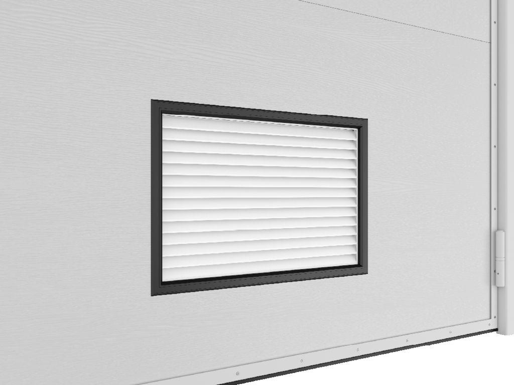 В створку может быть врезана калитка с порогом для удобного доступа в помещение при закрытых воротах. Возможно повышение освещенности помещения благодаря установке окон. Рамка окна со специальным уплотнением обеспечивает плотное прилегание к полотну ворот, что защищает от теплопотерь. Окантовка окна черного цвета сочетается с фурнитурой ворот. |