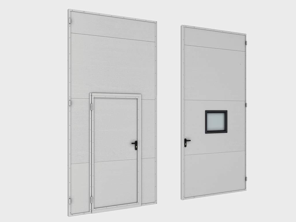 Две створки поставляются в сборе (сэндвич-панели толщиной 80 мм, стальные окантовочные профили, усиливающие уголки, петли со сменной осью, уплотнитель, механический замок). При автоматизации ворот по заданию заказчика замок в створки не устанавливается. Врезка калитки и окон выполняется опционально согласно техническому заданию. |