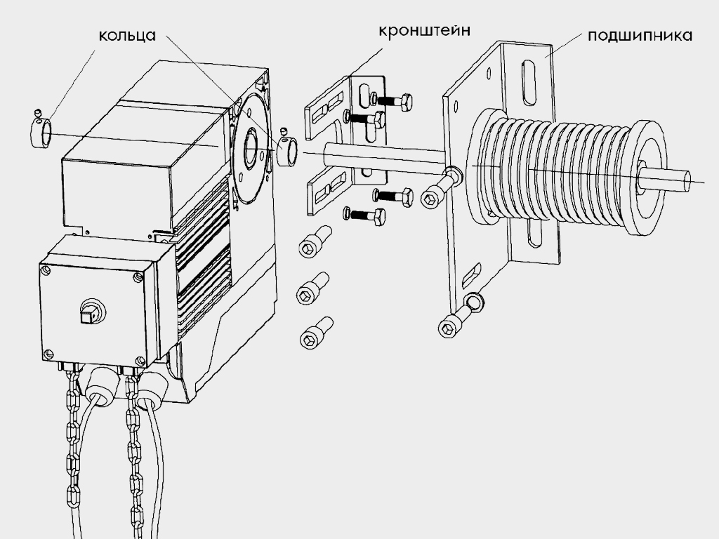 Монтаж осуществляется на вал ворот с помощью кронштейна, шпонки и стопорного кольца. Кронштейн крепления присверливaется к притолоке с помощью саморезов. |